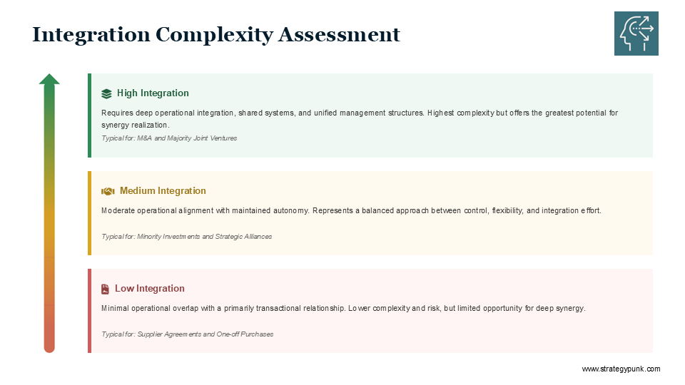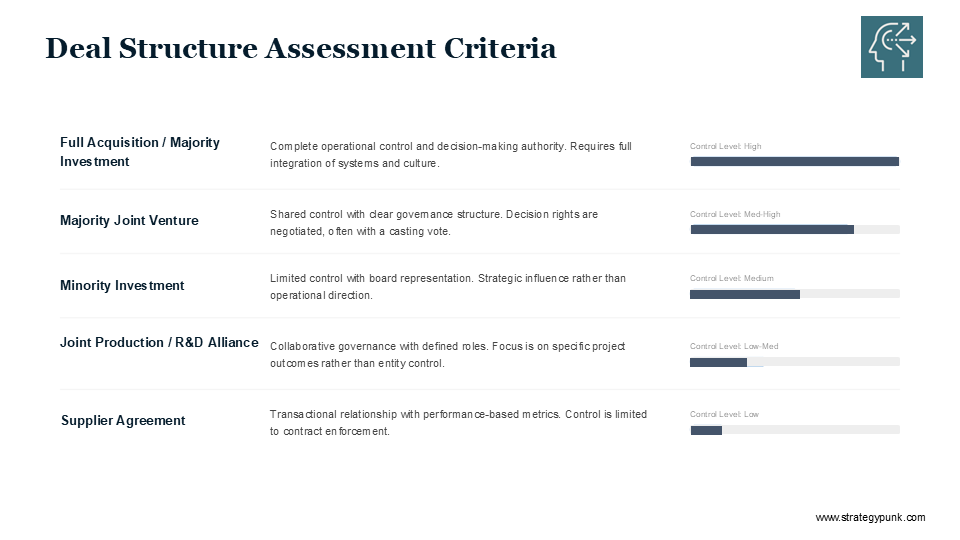 Consider a technology company seeking to enter a new market. They could pursue a full acquisition, form a joint venture, take a minority stake, establish an R&D alliance, or simply negotiate a supplier agreement. Each option carries different implications for control, capital requirements, integration complexity, and risk exposure.
