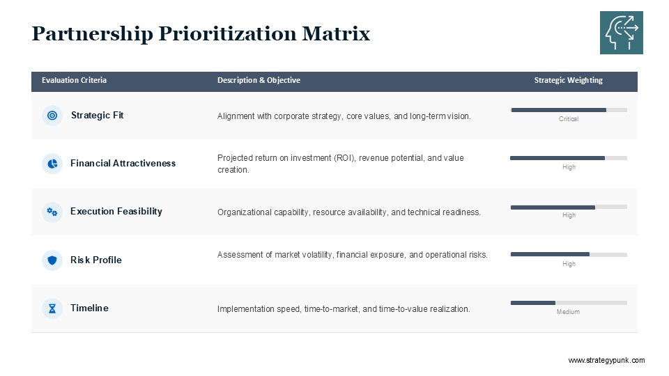 Strategic Fit (Critical): Does this partnership align with your corporate strategy, core values, and long-term vision? A financially attractive deal that pulls you away from your strategic direction will destroy more value than it creates.