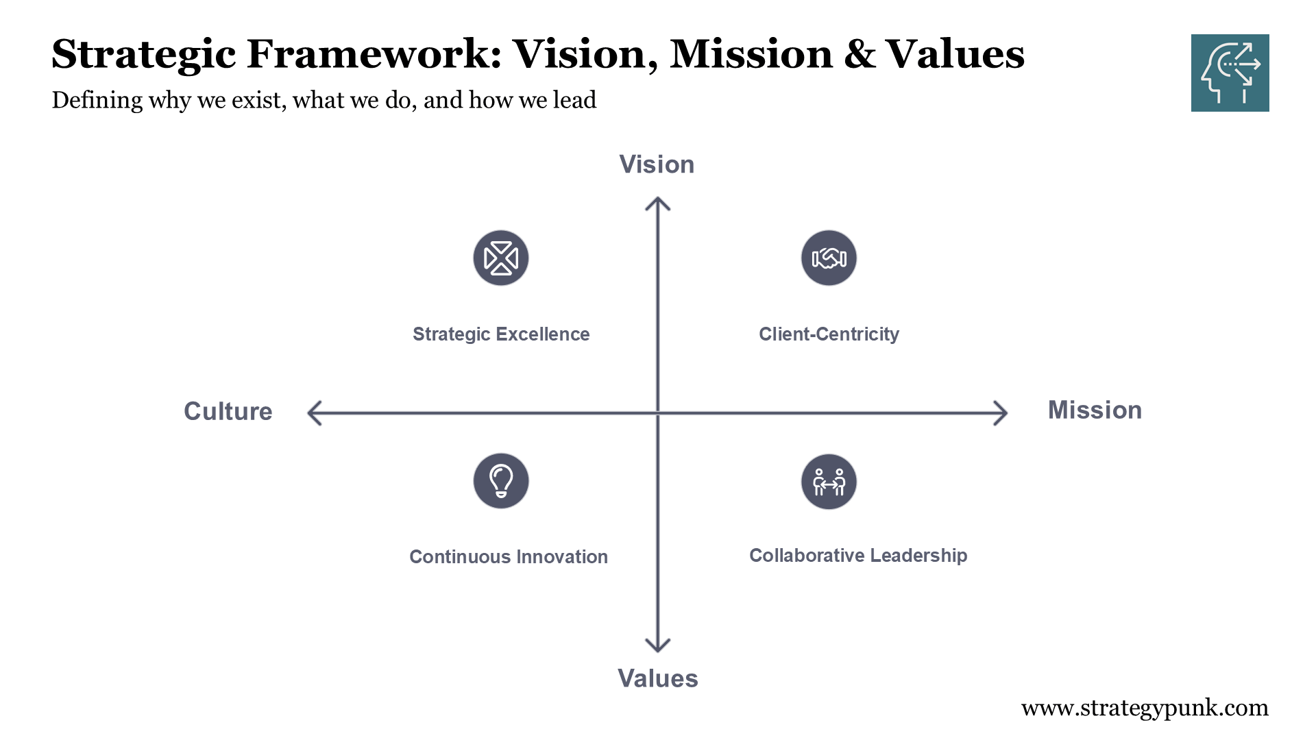 The framework I've developed treats vision, mission, and values as interconnected elements of a single strategic system:
