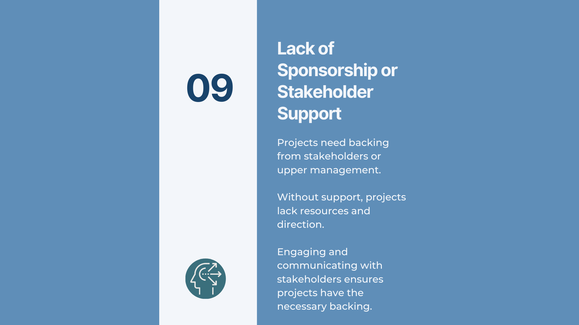 To avoid project failure due to a lack of sponsorship or stakeholder support, it is essential to identify and engage project champions or sponsors early on in the project planning process. Communicating regularly with stakeholders and addressing any concerns or issues is very important. By doing so, project managers can ensure their projects have the necessary support to succeed.