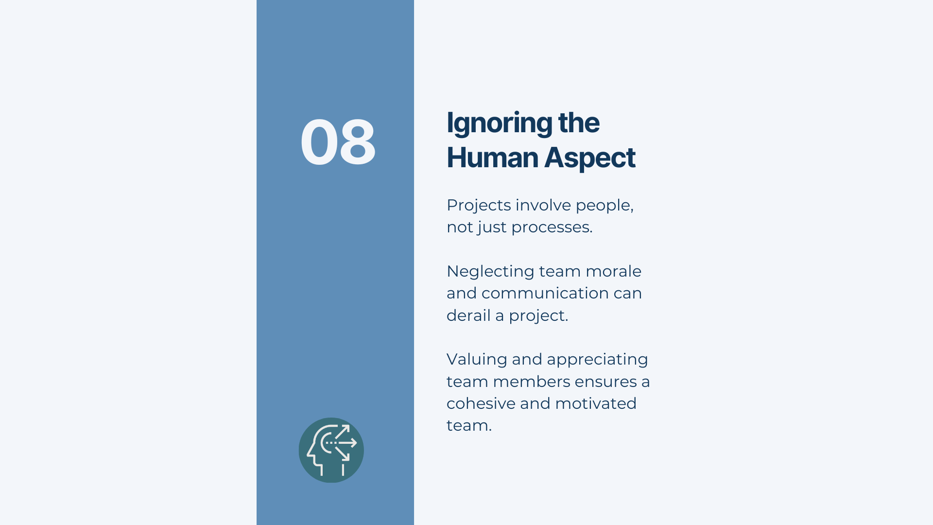 In conclusion, ignoring the human aspect of a project can lead to failure. Team morale and individual needs must be considered when planning and executing a project. Communication is also critical to a project's success. A project can achieve its goals and objectives by valuing and appreciating team members.