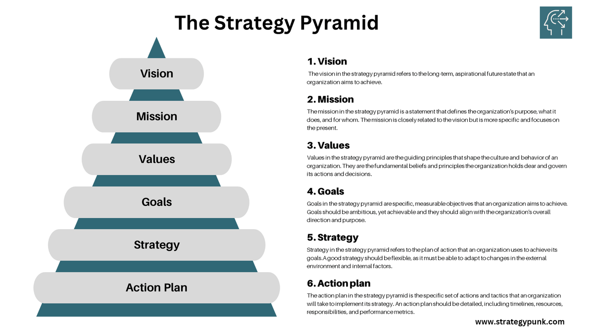 Strategic Planning with The Strategy Pyramid (Free Powerpoint). The strategy pyramid is a framework that helps organizations align their actions with their overall vision and mission.