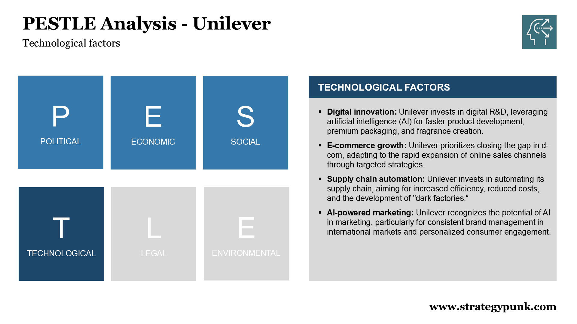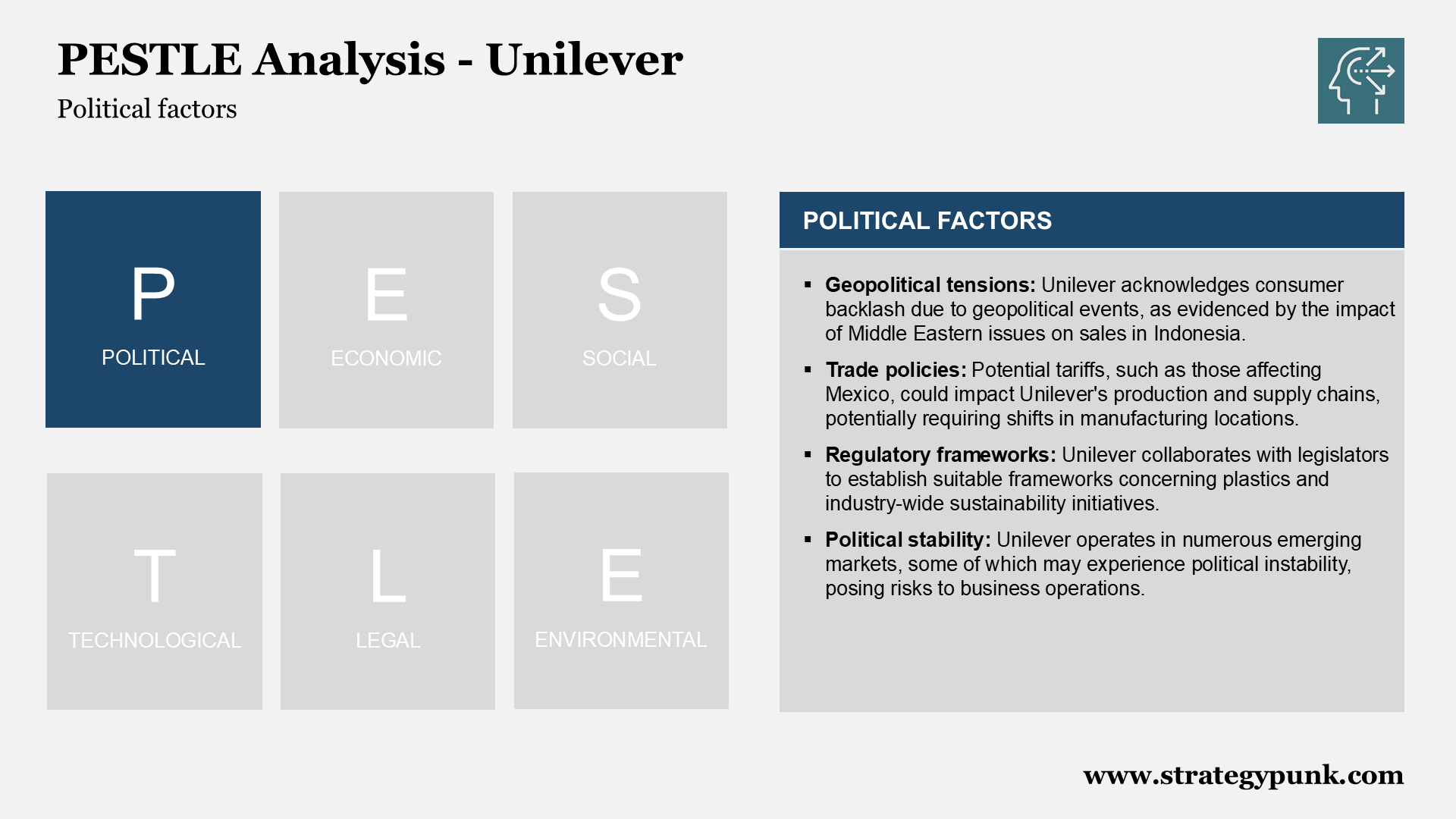 This PESTLE analysis examines the external factors that could impact Unilever's strategy.