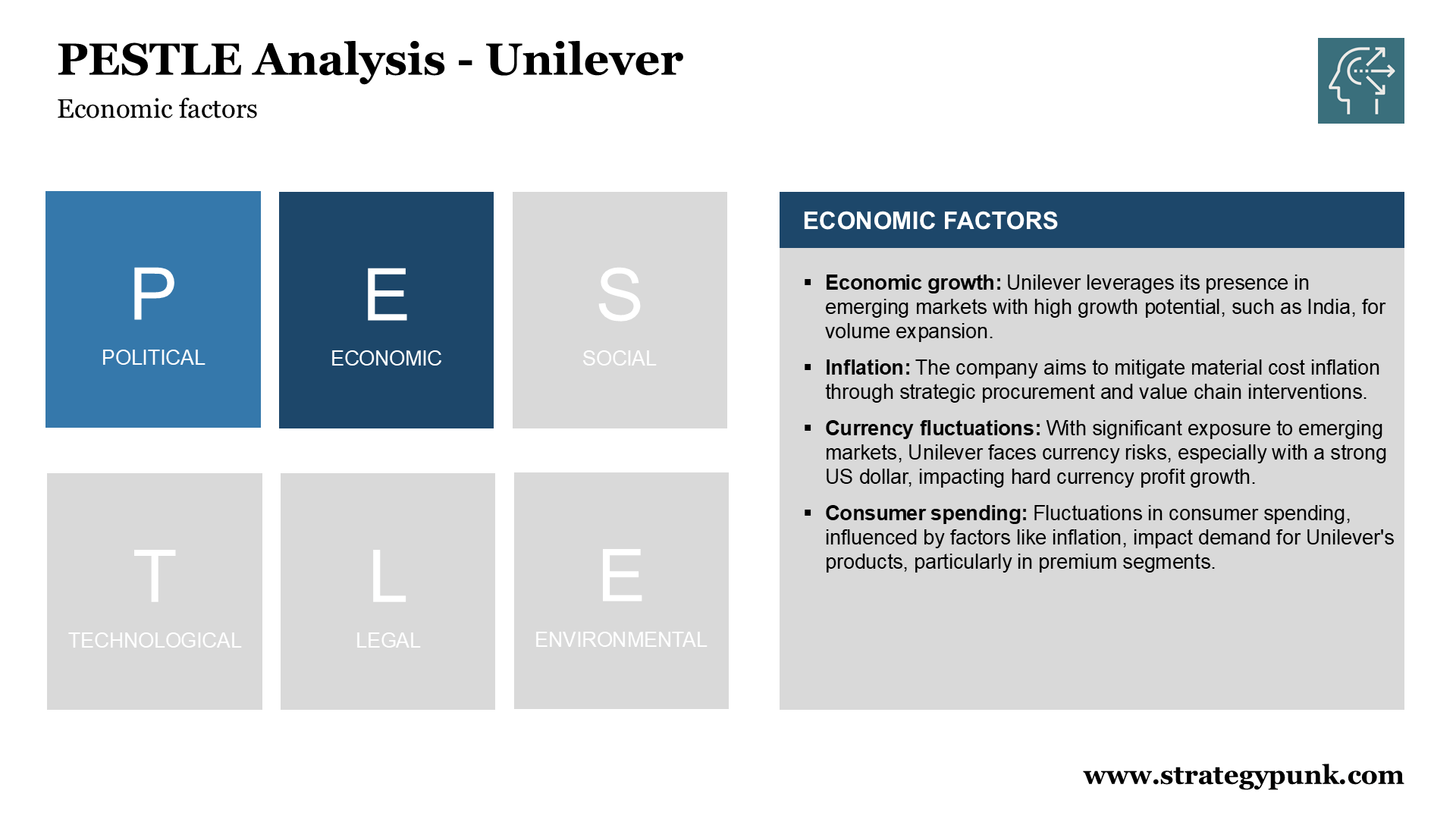 - Political stability: Unilever operates in numerous emerging markets, some of which may experience political instability, posing risks to business operations.